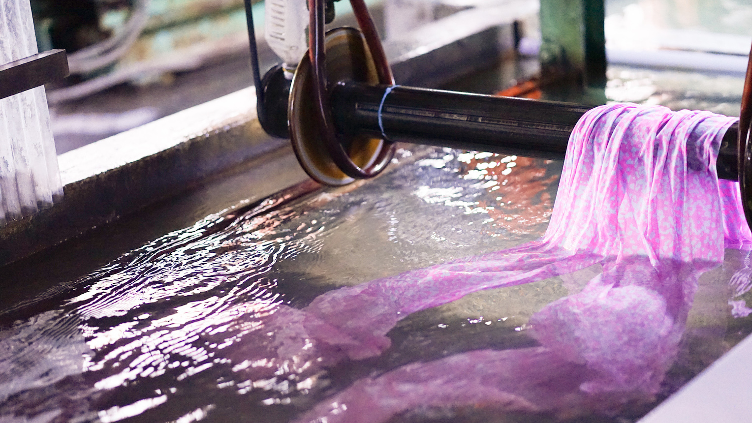 今回斉藤さんが選んでくださった工房は東京都足立区にある「旭染工」さん。デザインの表現力が高く、今でも多くの問屋さんからの注文がある、東京の注染工場です。工房の中に入ると驚かされるのはその職人の多さ。若い職人も多いためか、活気があり、技術の伝承が進んでいる様子を目にすることができます。