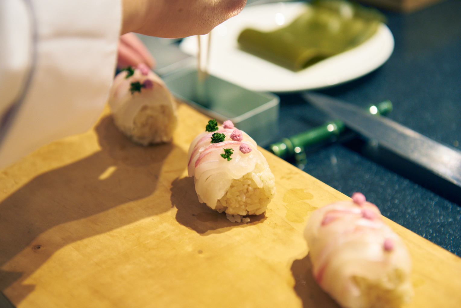そんな江口さんが一品目に取り掛かったのは、旬の食材「桜鯛」を使用して江戸時代の鮨を再現した「江戸時代のサイズ復元 桜すし」。使用する鯛の切り身は昆布締めにし、桜の葉の香りをつけたものを使います。