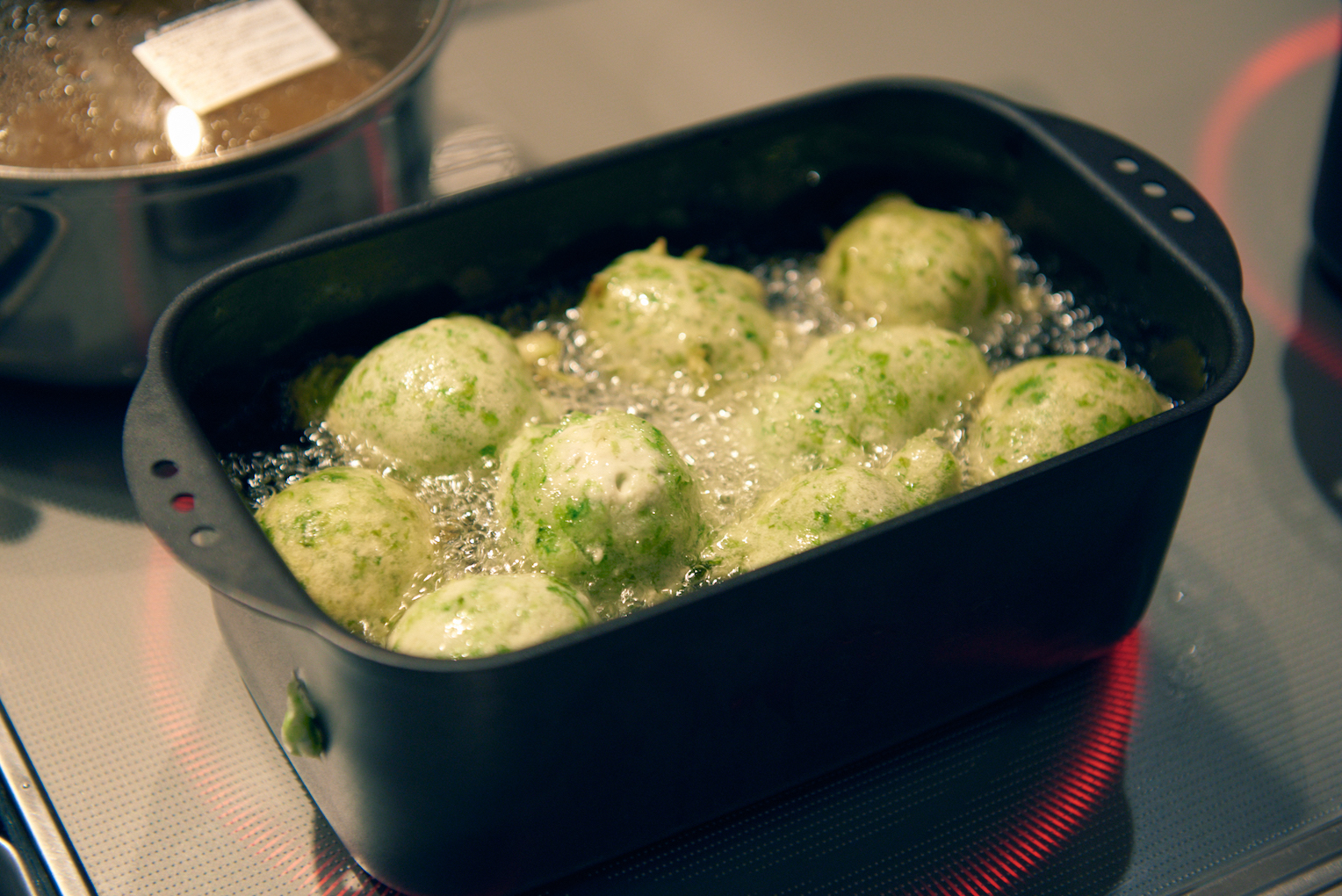 スロバキアでもやはりホワイトアスパラは人気があり、天ぷらとして供した経験があると江口さん。旬の野菜を揚げて楽しむのは、日本もヨーロッパも同じですね。なお、今回の生地には白玉粉を混ぜ、もちっとした食感をプラスしているとのこと。春の香りともちもち食感、両方を楽しめる和風ゼッポリーネの出来上がりです。