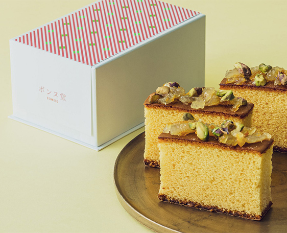 ⽇本橋江⼾桜通りを拠点とするカステラの⽼舗・⽂明堂東京と、⼈気のカジュアルフレンチLa Bonne Tableのコラボから⽣まれた“洋⽣カステラ ボンヌ堂”。卵黄卵白の重量比率5:3の濃厚な味わいを持つ特撰五三カステラと、ピスタチオの⾷感とカルダモンの⾹りが爽やかな柚⼦のコンフィチュールのマリアージュ。これまで⾷べ慣れてきたカステラにありそうでなかった、フレッシュな味わいをお楽しみください。 ※2022年春期限定販売